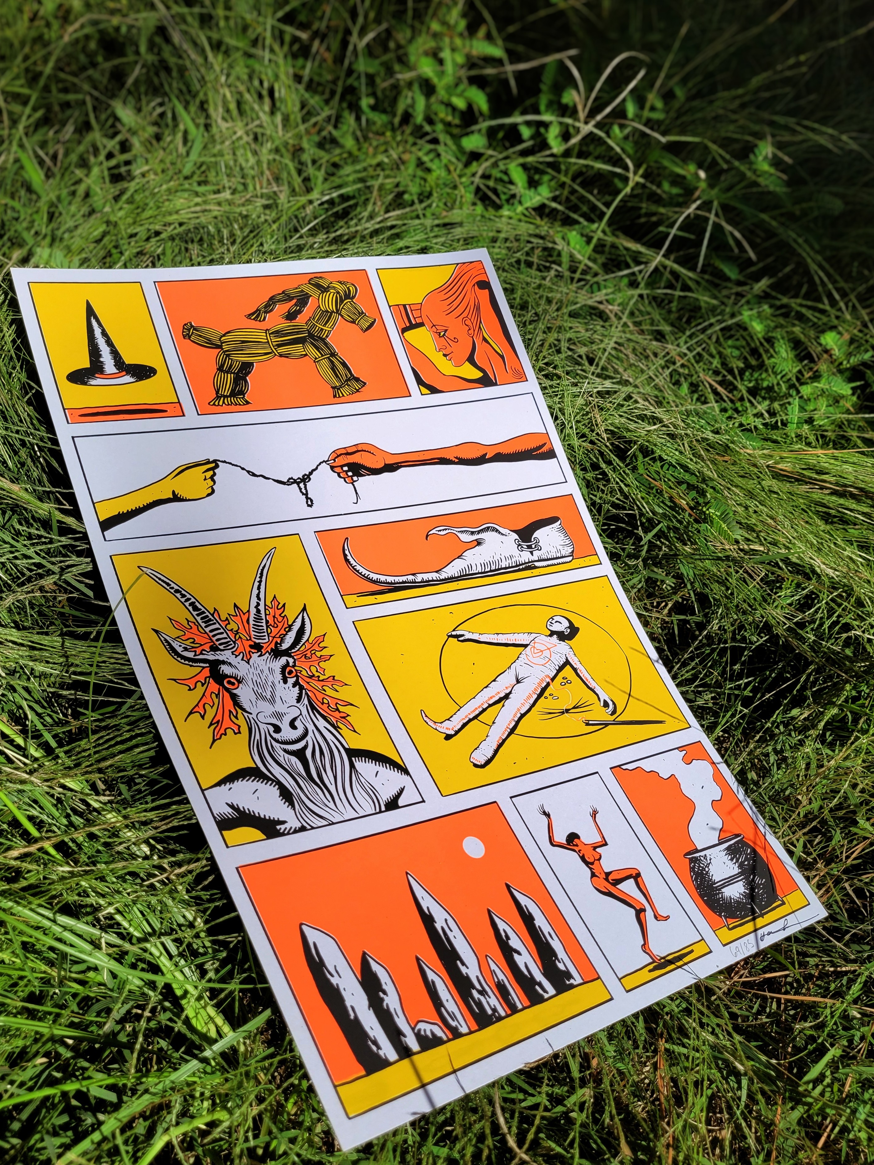 The trees are changing, the witches are dancing, and you need this print on your wall. Hand printed and trimmed.